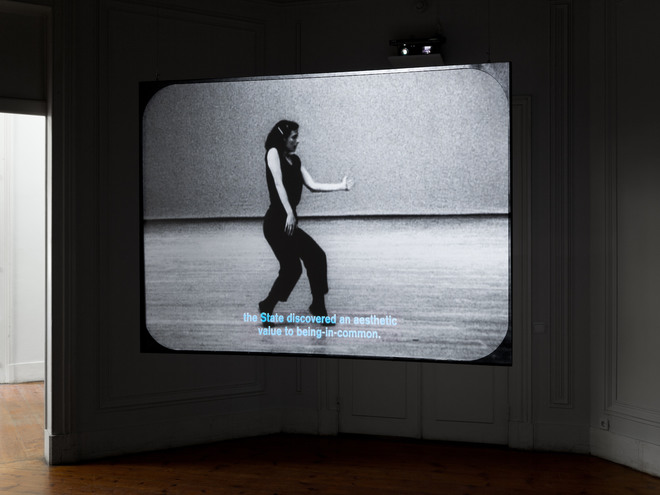 Mariana Silva, Uma composição para dois, a dois momentos diferentes, 2011, projeção vídeo, cor, 2 canais (projeção frontal: Yvonne Rainer, Trio A, 1978, DVD, alugado ao Video Data Bank, Chicago), 9'30''. Cortesia da artista e Kunsthalle Lissabon.