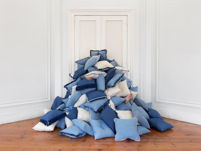 Patrizio Di Massimo, Mister, 2014, almofadas em ganga, algodão e tela, debrum e guarnições, borla, performance . Foto: Bruno Lopes. Cortesia do artista e Kunsthalle Lissabon.