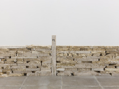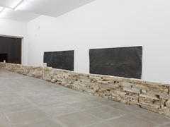 Jérémy Pajeanc, Passos em volta, muro de pedra de calcária e granítica, pilares de mármore com gravação P.E. Instalação Galeria Múrias Centeno, Porto, 2015. Fotografia Bruno Lopes- Cortesia do artista e Galeria Múricas Centeno.