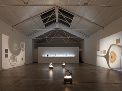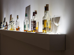 sobre parede. 3 garrafas de whisky, 4 copos de vidro, 2 casting, 3 retroprojector sobre chão. Instalação AR Sólido, Lisboa, 2015. Fotografia: Marco Pires. Cortesia do artista e AR Sólido.