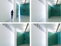Jérémy Pajeanc, Prefácio, em colaboração com João-Pedro Trindadee o apoio técnico-mecânico de Diego Novo, parede de gesso cartonado móvel motorizada, parede de gesso cartonado fixa com estrutura em calha metálica. Instalação Galeria Cristina Guerra, Lisboa, 2015. Fotografia Bruno Lopes. Cortesia do artista e Cristina Guerra Contemporary Art.